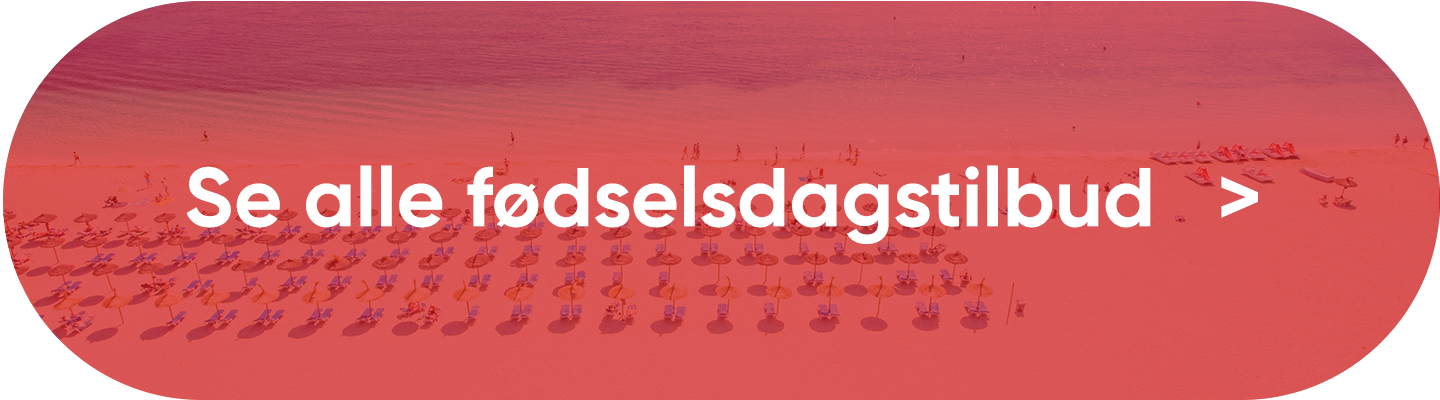 Tilbuddene er ”først til mølle”, da der er et begrænset antal pladser (maks. tre værelser pr. tilbud). Alle annoncerede priser er pr. person ved min. 2 personer pr. værelse i den billigste værelsestype (typisk dobbeltværelse eller 1-værelses lejlighed.) Tilbuddene er gyldige til og med 13. april 2026, eller så længe lager haves. Der tages forbehold for prisstigninger, trykfejl samt udsolgte afgange. Der vil forekomme tillæg for eneværelser. Børnepriser er pr. barn ved 2 fuldt betalende personer. Børnealderen kan variere fra hotel til hotel. Priserne er eksklusive transfer, transport af golfbag, indchecket bagage og mad ombord på flyet. Vores fødselsdagstilbud til De Kanariske Øer og Hurghada med afrejse fra oktober 2026 til og med april 2027 kan godt kombineres med stamkunderabat.